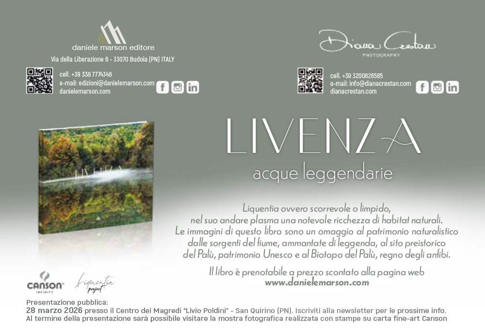 Il 28 marzo 2026 presso il Centro dei Magredi “Livio Poldini” - San Quirino (PN) verrà presentato il libro LIVENZA acque leggendarie di Diana Crestan pubblicato da Daniele Marson Editore. Le immagini di questo libro sono un omaggio al patrimonio naturalistico dalle sorgenti del fiume, ammantate di leggenda, al sito preistorico del Palù, patrimonio Unesco e al Biotopo del Palù, regno degli anfibi.